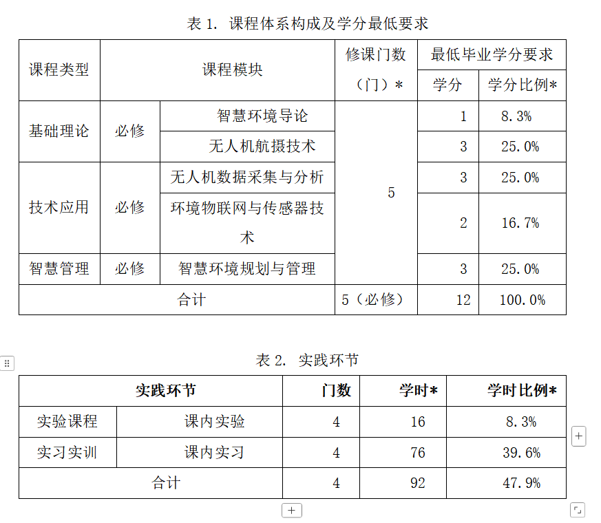 共设置5门课程,包括智慧环境导论、无人机航摄技术、无人机空间数据采集与分析、环境物联网与传感器技术和智慧环境规划与管理。共设置了12学分。
