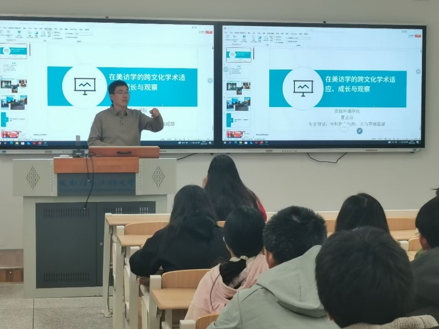 夏志业老师从学术适应、文化观察及个人成长三方面讲述了他两次在美科罗拉多州立大学、托莱多大学访学的经历及所见所感。他从学校申报、外语提升等前期准备鼓励同学们眼光星海、瞄准目标,珍惜当前大学美好时光,刻苦努力学习。在学术适应方面,他介绍了中美教育体系差异、教学过程、学术环境、研究范式及学术评价体系等,构成了第一道“文化冲击”。结合当前大学生普遍存在的问题,强调同学们大学学习的主动性、创新性、批判性及互动性等思维的重要性。文化观察方面,夏老师介绍了美国校园文化的多元与包容,通过有趣的案例让同学们体验跨文化,激励同学们反思自身学习、团队合作、行为习惯等,从中汲取有益资源,对自身重塑。个人成长方面,夏老师介绍了在美求学的中国学子的苦与乐。独立处理生活琐事、在陌生社交环境中建立新的人际网络,这些挑战与锻炼成为了个人成长的催化剂。