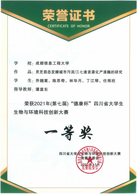 11月6日,第七届"德康杯"四川省大学生生物与环境科技创新大赛在四川农业大学雅安校区圆满落幕。通过学生和指导老师的共同努力,我院在本次大赛中有两件作品获奖:谭显东老师指导的乔翅嵩团队作品《灵芝固态发酵城市污泥/三七渣资源化产漆酶的研究》荣获一等奖,郝云庆老师指导的蒋梅团队作品《高校校园陆生脊椎动物多样性调查报告》获得三等奖。同时,谭显东老师荣获优秀指导教师奖。我院学子在该赛事上取得的优异成绩,是学校研究型人才培养的又一成果,展现了学生创新精神培养的阶段性成效。