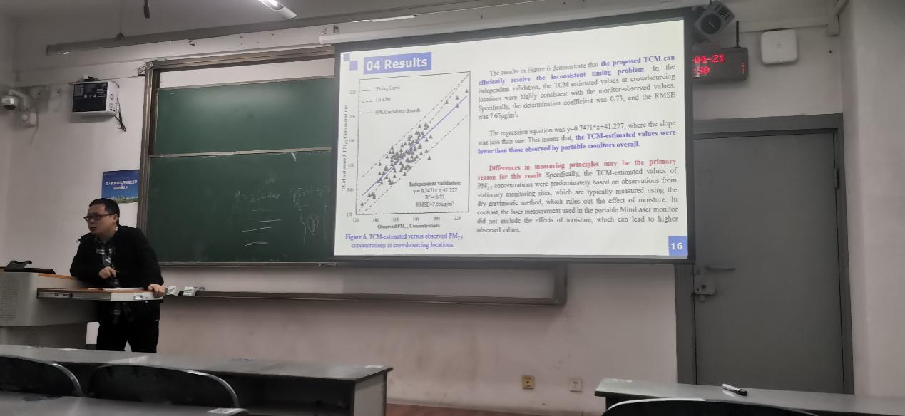 郑老师的PPT制作精细,全篇采用英文,PPT分为background、method、care study、result、conclusion五个部分。首先,郑老师为我们科普pm2.5的危害,因而此项研究目的在于找到精细化规避风险。郑老师以长沙为研究选址进行选点布点监测,为同学们介绍了插值法、土地回归法、扩散模型、遥感等方法,这些方法各有优势,也有各自的局限性。