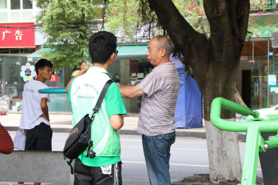 小分队队员向路过的老爷爷发放环保知识宣传手册