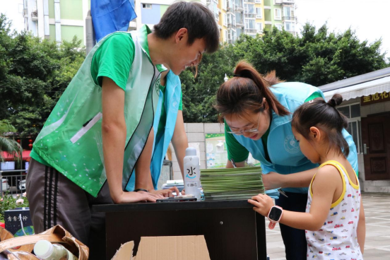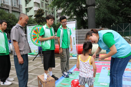 利用我院和社区提供的物资在社区布置好活动现场后,小分队为队员们分配工作,每个人负责自己的活动版块,现场秩序有条不紊。垃圾分类活动具体流程如下:活动参与人员在签到处签到,填写基本信息和我院前期准备的调查问卷,领取垃圾分类知识宣传小手册以及活动积分卡,随后在小分队成员的引导下参与各种垃圾分类小游戏,成功通过小游戏则可获取积分兑换小分队为居民准备的精美奖品。