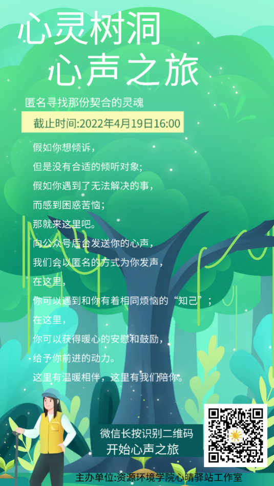 2022年4月,伟德国际1949伟德国际1949开展“心灵树洞,岁月与共”线上心理健康活动。本次活动旨在引导大学生诉说心声,增强自我心理认知能力,关注自身心理健康,提高心理素质。