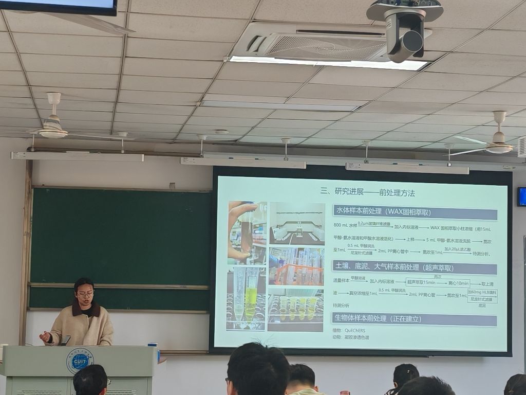李小林针对“永久化学品”PFAS的生态风险,通过青藏高原草场样本分析,首次发现土壤有机质含量与PFAS吸附量呈显著正相关(R²=0.83)。研究提出“改性生物炭-植物联合修复”方案,可降低PFAS生物有效性达65%,为高寒生态系统污染防控提供了科学依据。汇报中,师生就土壤基质效应消除方法进行了技术探讨。