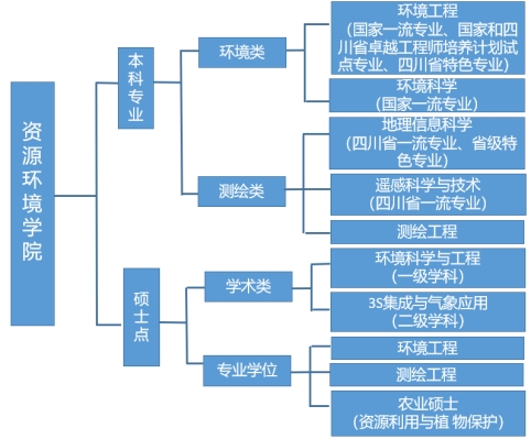 学院现有环境工程(1999年招生)、环境科学(2009年招生)、地理信息科学(2002年招生)、遥感科学与技术(2008年招生)、测绘工程(2011年招生)五个本科专业,其中环境工程和环境科学为国家一流专业建设点,地理信息科学、遥感科学与技术为省级一流专业建设点;同时,环境工程和地理信息科学是省级特色专业,环境工程是四川省和国家卓越工程师培养计划试点专业,2019年通过工程教育专业认证,现有环境科学与工程(一级学科)、环境工程、测绘工程(二级学科)工程硕士3S集成与气象应用(二级学科)、农业硕士(资源利用与植物保护领域)等学位授权点。